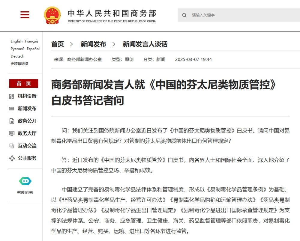 問:我們關(guān)注到國務院新聞辦公室近日發(fā)布了《中國的芬太尼類物質(zhì)管控》白皮書。請問中國對易制毒化學品出口貿(mào)易有何規(guī)定?對管制的芬太尼類物質(zhì)前體出口有何管理規(guī)定?