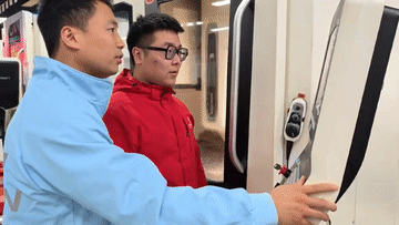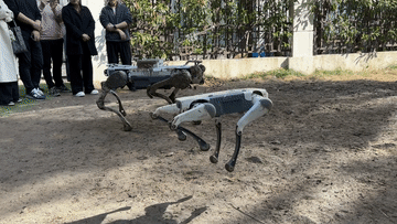 楊俊(左二)和同事為客戶展示一款行業(yè)應(yīng)用四足機(jī)器人。