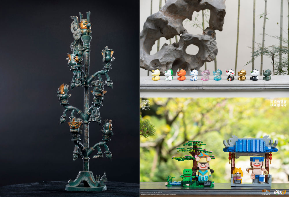 這是曾舟以青銅神樹、鎮(zhèn)水石犀、說唱俑等為原型設(shè)計(jì)的部分文創(chuàng)產(chǎn)品。