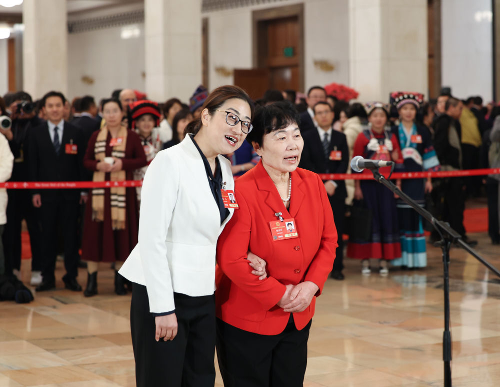 3月8日,第十四屆全國(guó)人民代表大會(huì)第三次會(huì)議第二場(chǎng)“代表通道”集中采訪(fǎng)活動(dòng)在北京人民大會(huì)堂舉行。這是全國(guó)人大代表盛弘(左)和楊寶玲向廣大婦女致以節(jié)日祝福。新華社記者 呂帥 攝