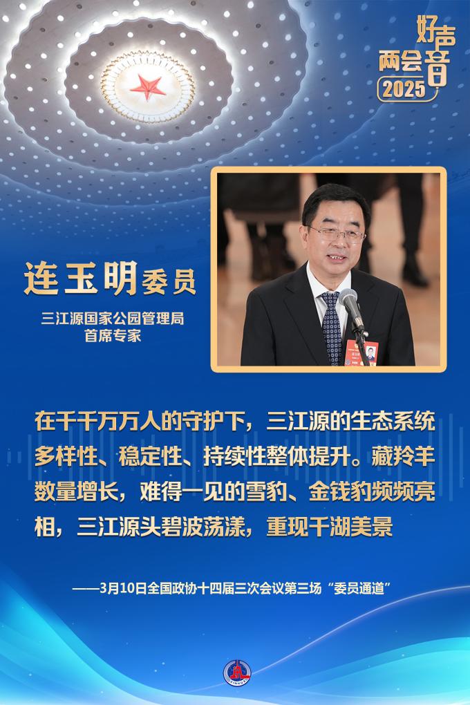 第一位回答記者提問(wèn)的三江源國(guó)家公園管理局首席專家連玉明委員,是一名援青干部。他告訴大家,在三江源國(guó)家公園,有21432名生態(tài)管護(hù)員。在千千萬(wàn)萬(wàn)人的守護(hù)下,三江源的生態(tài)系統(tǒng)多樣性、穩(wěn)定性、持續(xù)性整體提升。藏羚羊數(shù)量增長(zhǎng),難得一見(jiàn)的雪豹、金錢豹頻頻亮相,三江源頭碧波蕩漾,重現(xiàn)千湖美景。