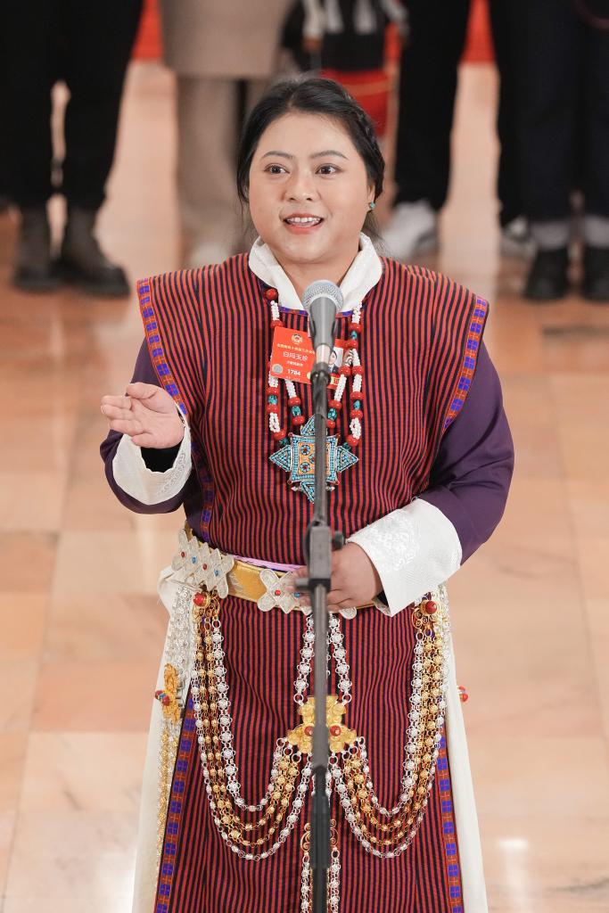 3月10日,全國(guó)政協(xié)十四屆三次會(huì)議第三場(chǎng)“委員通道”集體采訪活動(dòng)在北京人民大會(huì)堂舉行。這是全國(guó)政協(xié)委員白瑪玉珍接受媒體采訪。新華社記者 才揚(yáng) 攝