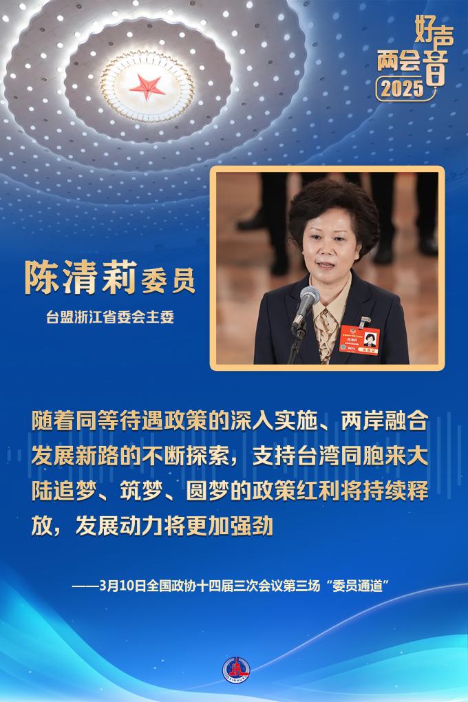 臺(tái)盟浙江省委會(huì)主委陳清莉委員分享了臺(tái)灣同胞在浙江生活、創(chuàng)業(yè)的故事。她表示,隨著同等待遇政策的深入實(shí)施、兩岸融合發(fā)展新路的不斷探索,支持臺(tái)灣同胞來(lái)大陸追夢(mèng)、筑夢(mèng)、圓夢(mèng)的政策紅利將持續(xù)釋放,發(fā)展動(dòng)力將更加強(qiáng)勁。