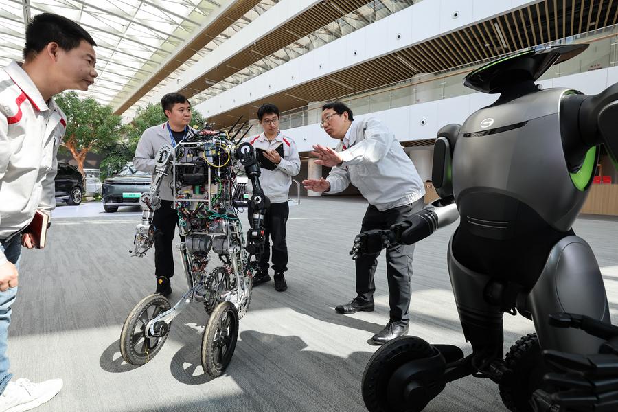 2025年2月24日,全國人大代表馮興亞(右一)在廣州向廣汽第三代具身智能人形機器人團隊工程師了解該型機器人的AI自主控制技術(shù)突破和應(yīng)用場景創(chuàng)新情況。新華社記者 劉大偉 攝