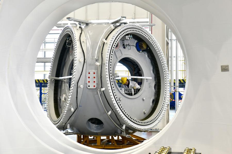 2025年2月22日,在三一重能(日照)風電設(shè)備制造有限公司,工作人員在風電設(shè)備生產(chǎn)車間忙碌。新華社記者 郭緒雷 攝