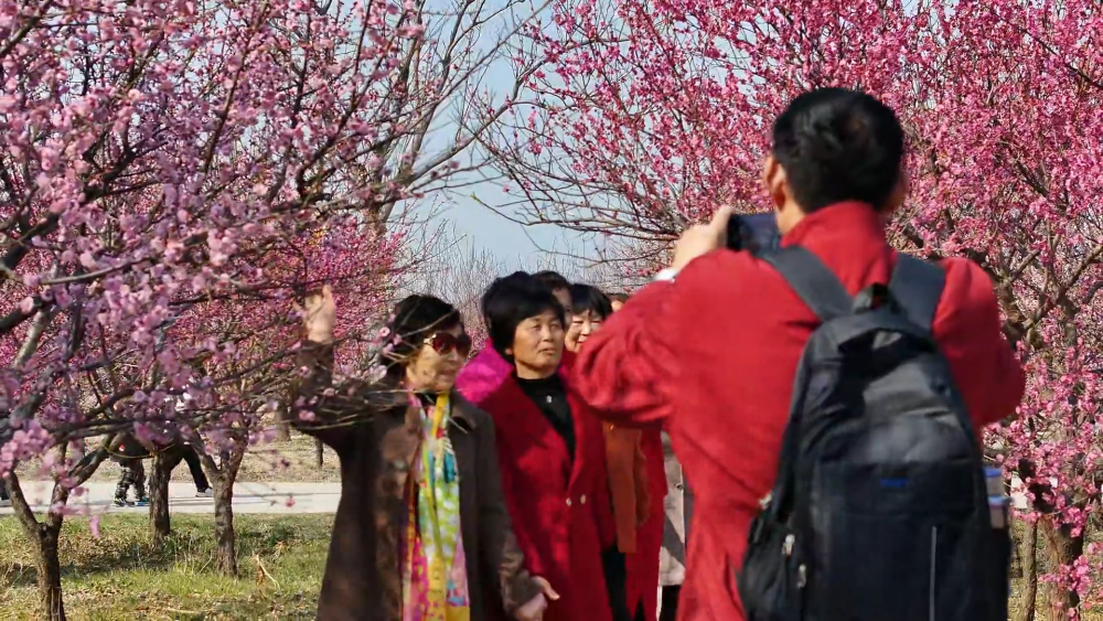 春日里,鄭州市惠濟(jì)區(qū)黃河灘地公園黃河梅園中的梅花次第開放,眾多賞花的游客紛紛前來打卡。(龐錦鵬 攝制)