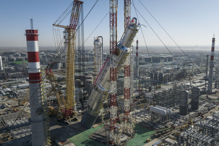 2月26日拍攝的華錦阿美精細(xì)化工及原料工程項目芳烴聯(lián)合裝置抽余液塔吊裝施工現(xiàn)場(無人機(jī)照片)。 新華社記者 潘昱龍 攝