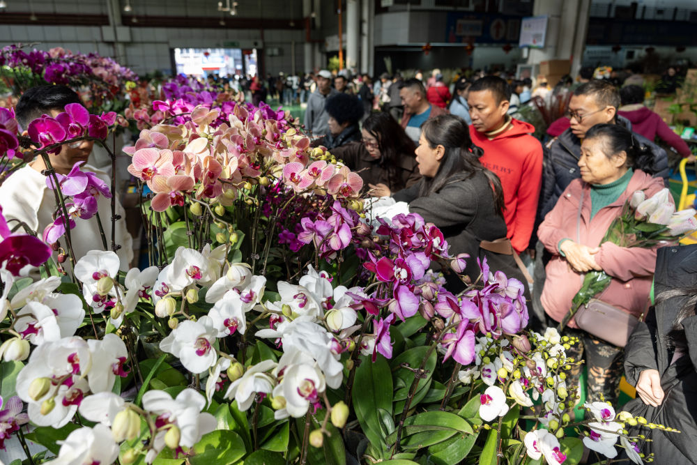 這是2025年1月22日拍攝的云南昆明斗南花卉市場(chǎng)一樓交易大廳,市民和游客在選購(gòu)鮮花。新華社記者 陳欣波 攝