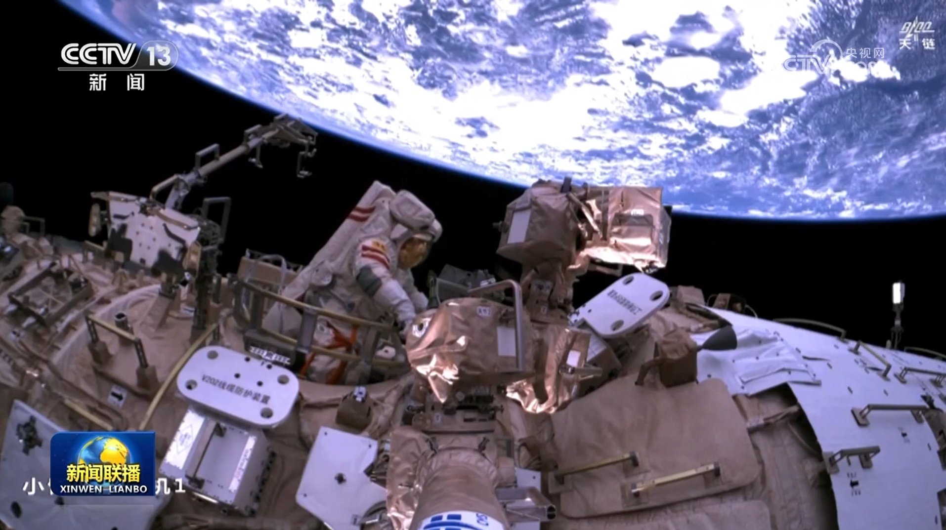 大約2個小時后,航天員宋令東也順利出艙,攀爬轉(zhuǎn)移至節(jié)點艙環(huán)形扶手處。隨著機械臂運動至艙外操作臺傳遞點,宋令東配合蔡旭哲傳遞、安裝問天艙和氣閘艙的防護裝置,并安裝節(jié)點艙固定裝置底座。航天員王浩澤在天和核心艙內(nèi)密切協(xié)同。