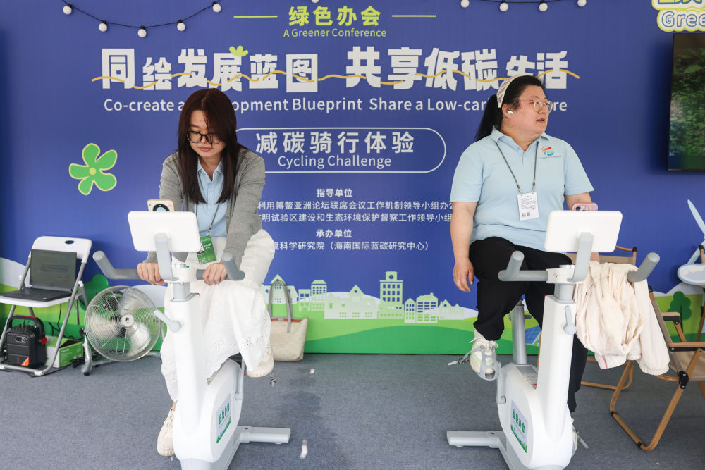 3月25日,參會人員在博鰲東嶼島文化公園內(nèi)體驗減碳騎行活動。