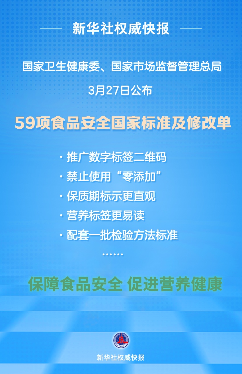 國(guó)家衛(wèi)生健康委、國(guó)家市場(chǎng)監(jiān)督管理總局3月27日公布了50項(xiàng)食品安全國(guó)家標(biāo)準(zhǔn)和9項(xiàng)標(biāo)準(zhǔn)修改單,這些標(biāo)準(zhǔn)與公眾日常消費(fèi)的乳制品、肉制品、特殊醫(yī)學(xué)用途嬰兒配方食品、嬰幼兒輔助食品、食品添加劑、消毒劑等密切相關(guān)。