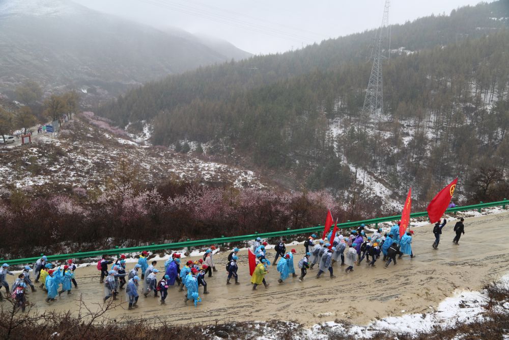 2021年,固原二中和弘文中學(xué)師生經(jīng)歷了迄今為止最艱難的一次徒步:一路上雨雪交加,很多學(xué)生的鞋子被雨水泡濕,不時陷入泥潭,相互協(xié)助才能拔出;有些路段處處泥水坑,只能一步一步趟水前行,鞋子不時“呲呲”發(fā)聲;回程時由于下山道路實(shí)在泥濘難行,不得不臨時改變線路,沿著山頂返回,拉長路途……