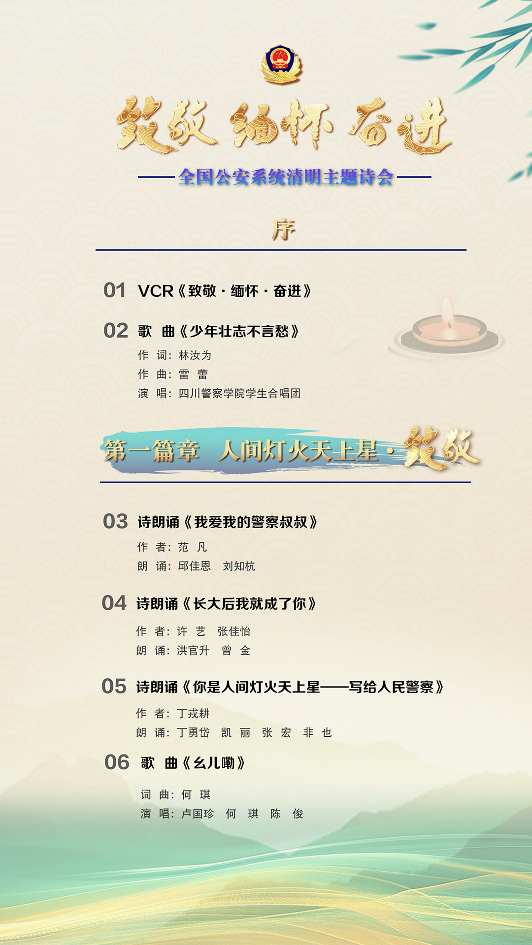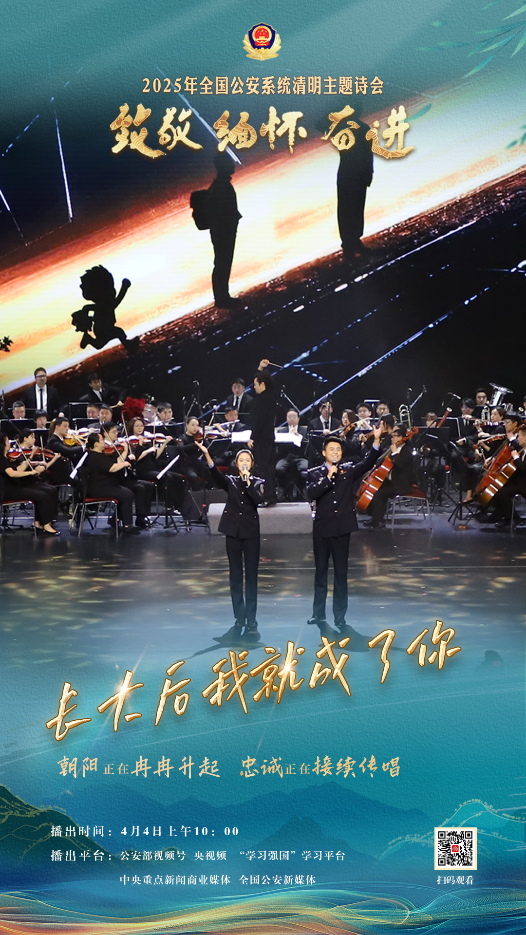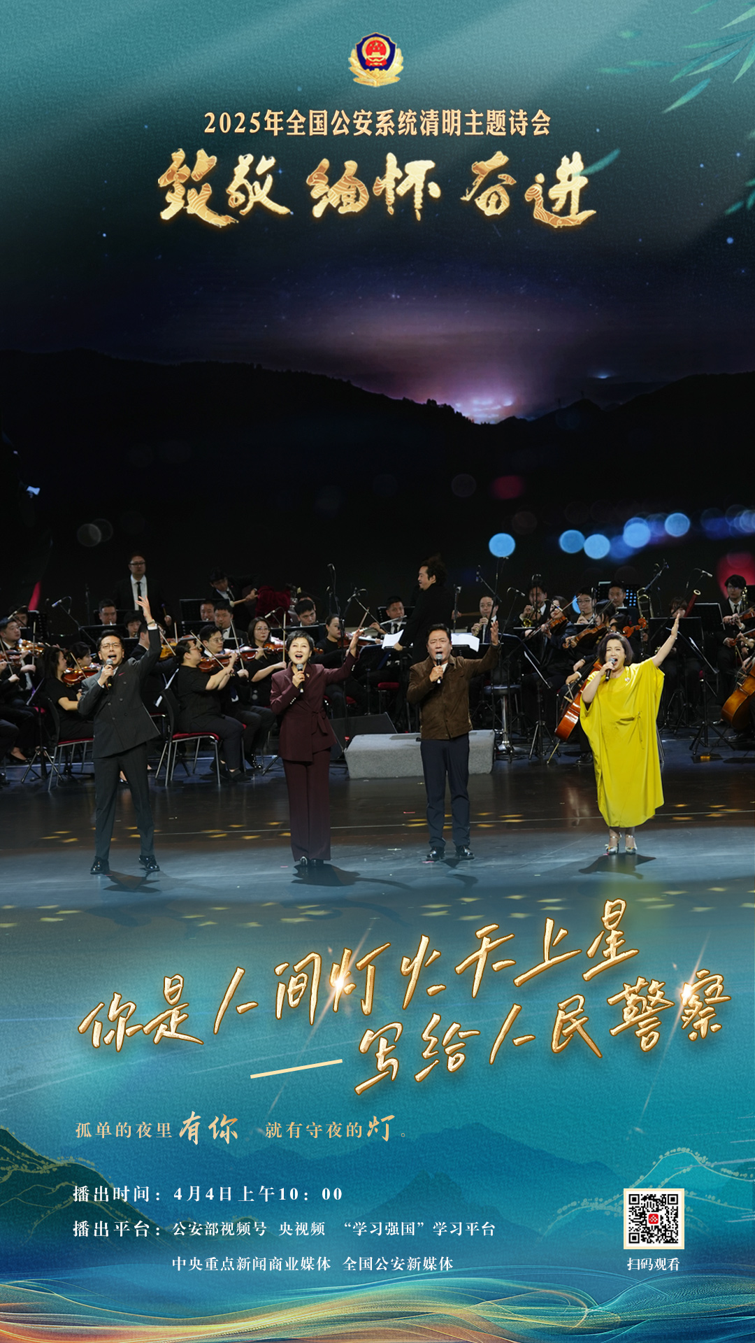 為充分展現(xiàn)全國公安機關(guān)和廣大公安民警、輔警時刻銘記習(xí)近平總書記的關(guān)心關(guān)懷,時刻為黨和人民而戰(zhàn)的忠誠政治本色,深情追憶一年來公安系統(tǒng)涌現(xiàn)的英雄模范感人事跡,激勵引導(dǎo)廣大公安民警以更加奮發(fā)有為的精神面貌,堅決履行好黨和人民賦予的神圣職責(zé)使命,今年清明節(jié)當(dāng)天,公安部新聞宣傳局、全國公安文聯(lián)、四川省公安廳聯(lián)合舉辦“致敬·緬懷·奮進”2025年全國公安系統(tǒng)清明主題詩會。