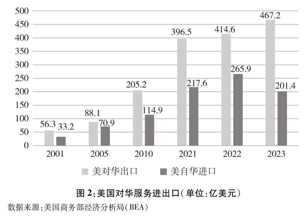 美國(guó)服務(wù)業(yè)產(chǎn)業(yè)門類齊全,具有較強(qiáng)國(guó)際競(jìng)爭(zhēng)力??傮w來看,隨著經(jīng)濟(jì)不斷發(fā)展和人民生活水平提升,中國(guó)對(duì)服務(wù)需求明顯擴(kuò)大,中美雙方服務(wù)貿(mào)易快速增長(zhǎng)。據(jù)美國(guó)商務(wù)部統(tǒng)計(jì),2001-2023年,中美服務(wù)貿(mào)易額由89.5億美元擴(kuò)大到668.6億美元,增長(zhǎng)了6倍(圖2)。根據(jù)中方統(tǒng)計(jì),2023年,美國(guó)是中國(guó)第二大服務(wù)貿(mào)易伙伴;據(jù)美方統(tǒng)計(jì),中國(guó)是美國(guó)第五大服務(wù)出口目的地。