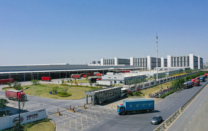 春風(fēng)和煦,楊柳輕舞,從合肥市區(qū)驅(qū)車向北約35公里,行至長豐縣中南部的下塘鎮(zhèn),以比亞迪命名的主干道上,運送汽車零部件的貨車排成長長一列,魚貫而入比亞迪合肥基地園區(qū)。