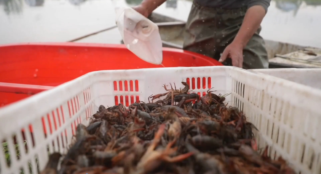 剛出水的小龍蝦被立即送往分揀中心,進行質量檢驗和稱重分級。分揀線上,分揀工岳臘春戴著橡膠手套,指尖翻飛間完成了龍蝦的分級。岳臘春說,“我們是發(fā)月工資,一個月5000元,一天工作按貨的多少來定?!?/p>