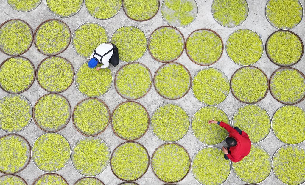4月7日,在湖南省永州市雙牌縣上梧江瑤族鄉(xiāng)盤家村云臺山生態(tài)有機茶園,茶農在攤曬春茶(無人機照片)。新華社發(fā)(何紅福攝)
