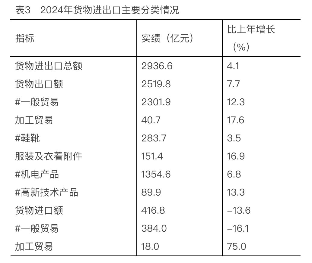 2024年,溫州全年貨物進(jìn)出口總額2936.6億元,比上年增長(zhǎng)4.1%,其中出口2519.8億元,主要涉及鞋、服、機(jī)電產(chǎn)品等領(lǐng)域。貿(mào)易空間持續(xù)拓展,對(duì)共建“一帶一路”國(guó)家、東盟、拉丁美洲出口額分別比上年增長(zhǎng)6.8%、16.3%、12.6%。