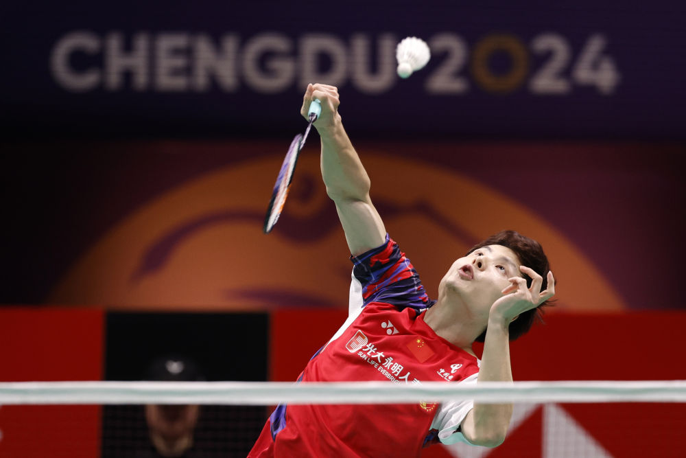 2024年5月5日,在四川成都舉行的2024年湯姆斯杯羽毛球團(tuán)體賽決賽中,中國隊選手石宇奇在男子單打比賽中回球。新華社記者 沈伯韓 攝