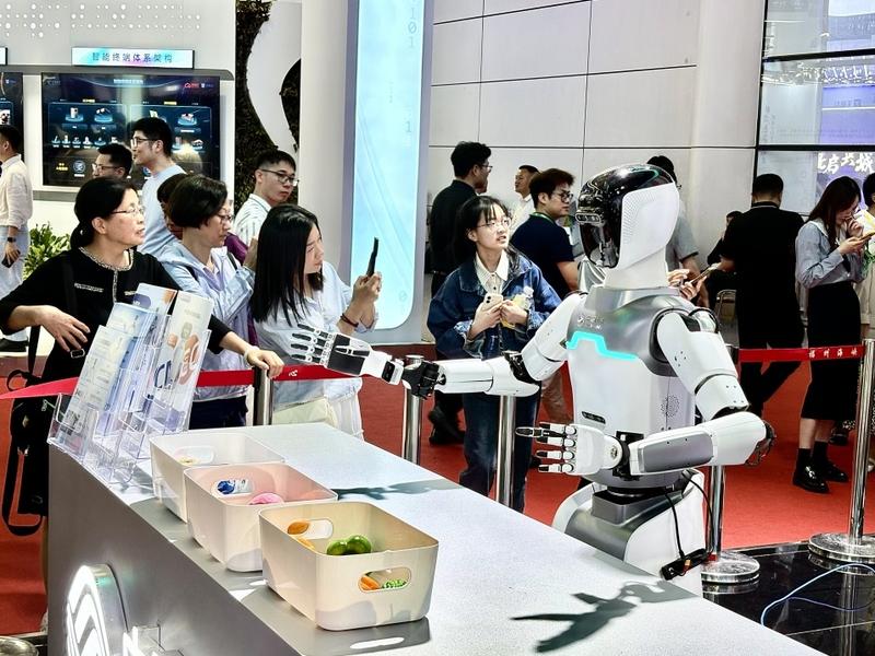 第八屆數(shù)字中國建設(shè)峰會現(xiàn)場,游客駐足圍觀人形機器人。(鄭雅梅 攝)