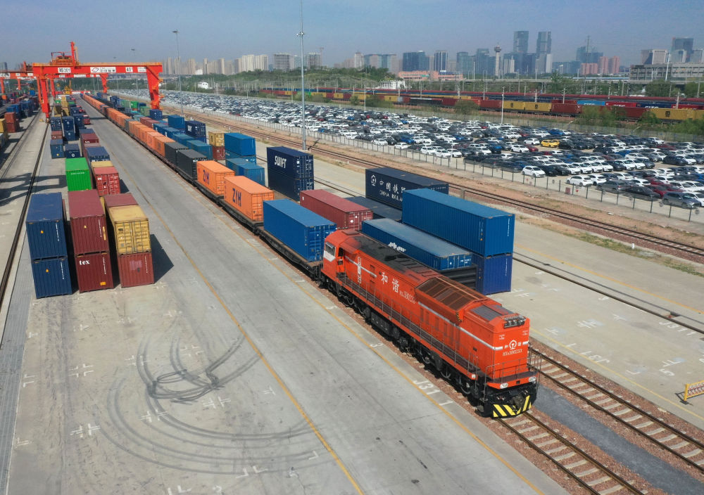 2025年4月15日,X8003次中歐班列(鄭州)停靠在國(guó)鐵集團(tuán)鄭州局圃田車站(無(wú)人機(jī)照片)。新華社記者 李嘉南 攝