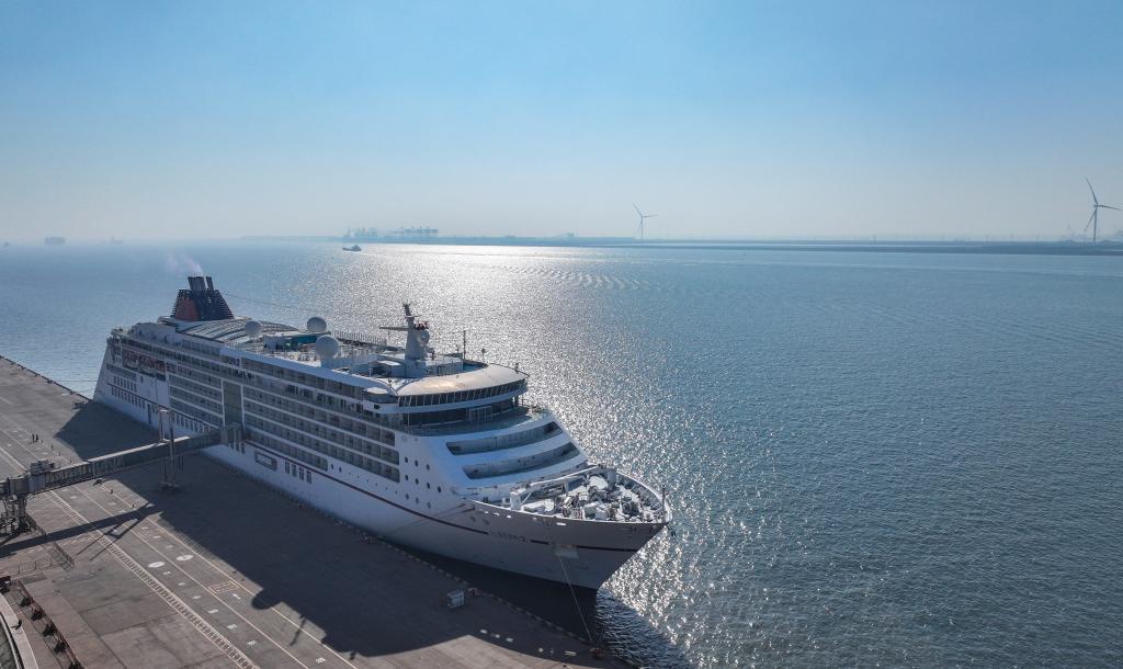 “歐羅巴2”號郵輪靠泊天津國際郵輪母港(無人機照片)。新華社記者孫凡越攝