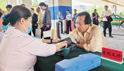 “您這血壓有點高,‘五一’假期活多,別忘了吃藥?!薄坝涀±?,謝謝。”51歲的司機楊建民在門口的義診攤位量完血壓,整理著衣袖。