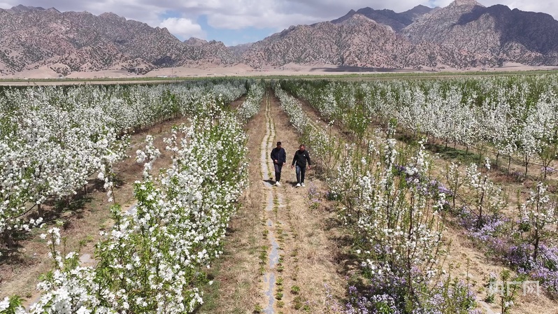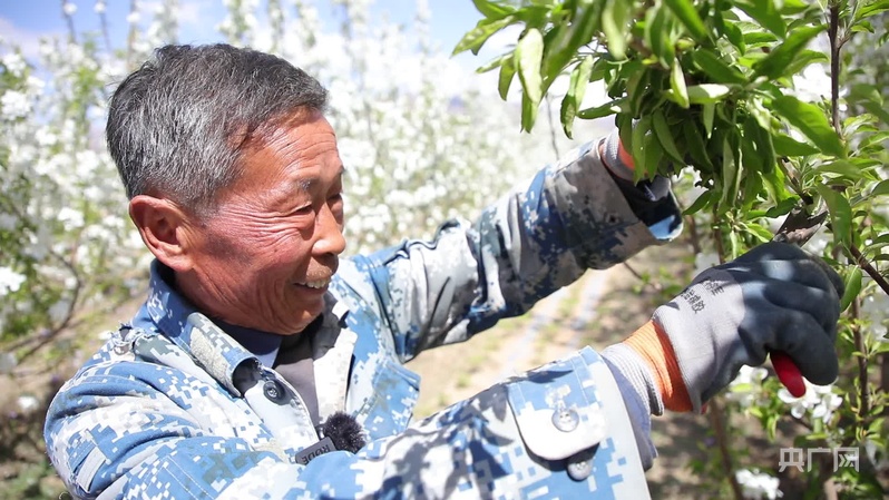 步入內(nèi)蒙古巴彥淖爾市烏拉特前旗白彥花鎮(zhèn)塔漢其嘎查林果產(chǎn)業(yè)園,大片果樹迎來最美花期,微風(fēng)拂過,花香沁人心脾,果園里村民高忠標(biāo)正專注地修剪著果樹?!拔医衲?0多歲了,在這里打工五六年了,一個(gè)月能掙五六千塊錢,挺好的?!?/p>