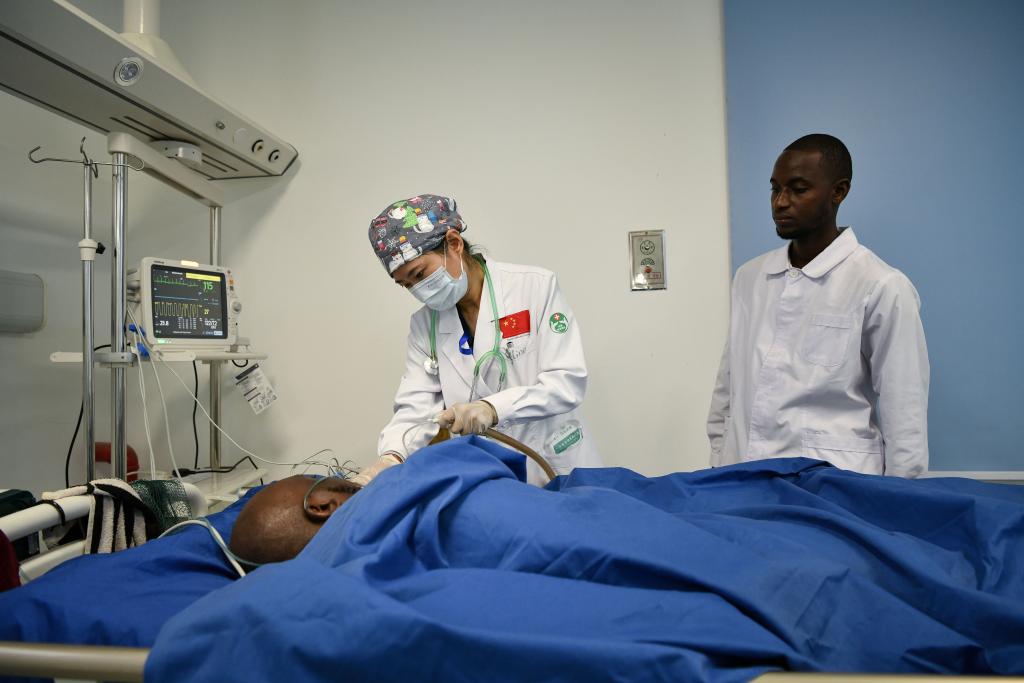 4月29日,在幾內(nèi)亞首都科納克里的中幾友好醫(yī)院,第31批援幾內(nèi)亞中國醫(yī)療隊(duì)醫(yī)生齊志麗(上左)在重癥監(jiān)護(hù)病房?jī)?nèi)救治患者。新華社記者 韓旭 攝