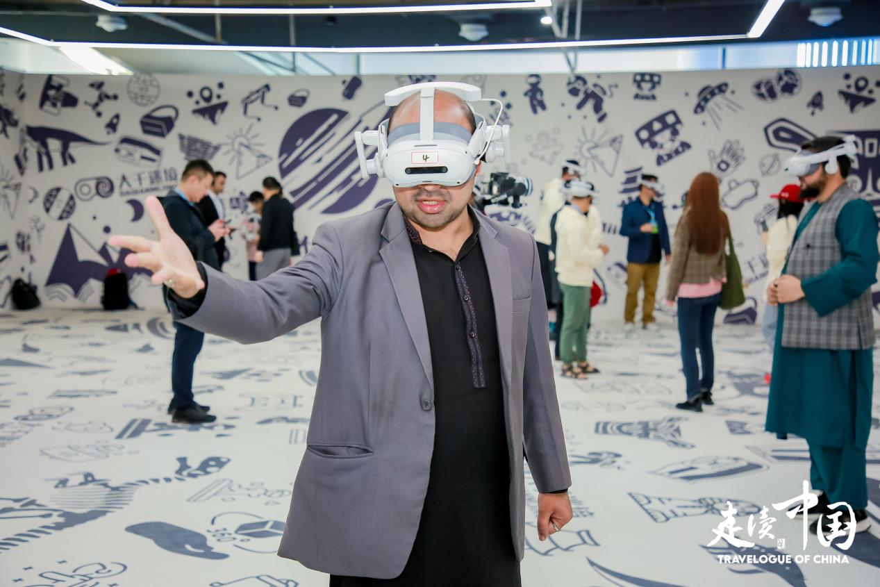 巴基斯坦記者賽義德·奧恩·穆罕默德佩戴VR設(shè)備體驗(yàn)互動(dòng)場景