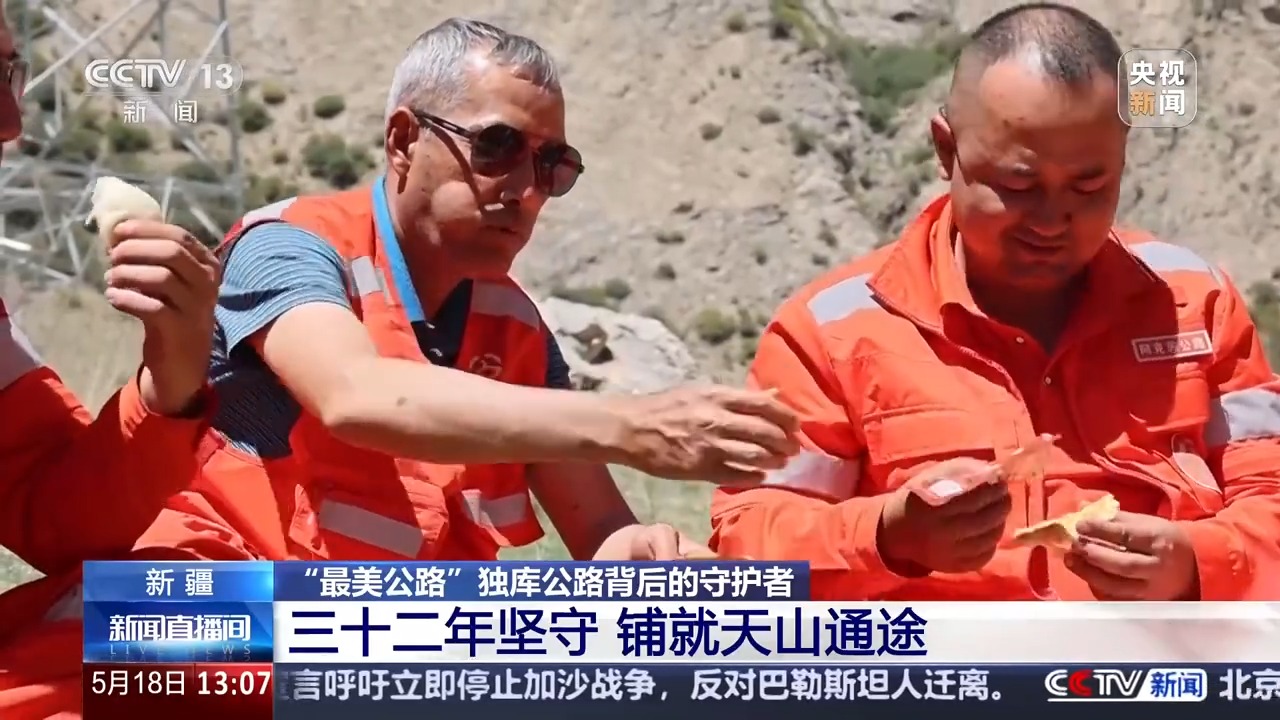下午兩點多,亞克甫招呼大家停下來吃午飯。這幾天,亞克甫和同事們要搶在獨庫公路通車之前,把冰封了一個冬天的道路養(yǎng)護(hù)好。他們經(jīng)常沒時間回到養(yǎng)護(hù)站休整,午飯也只能在路邊對付一下。