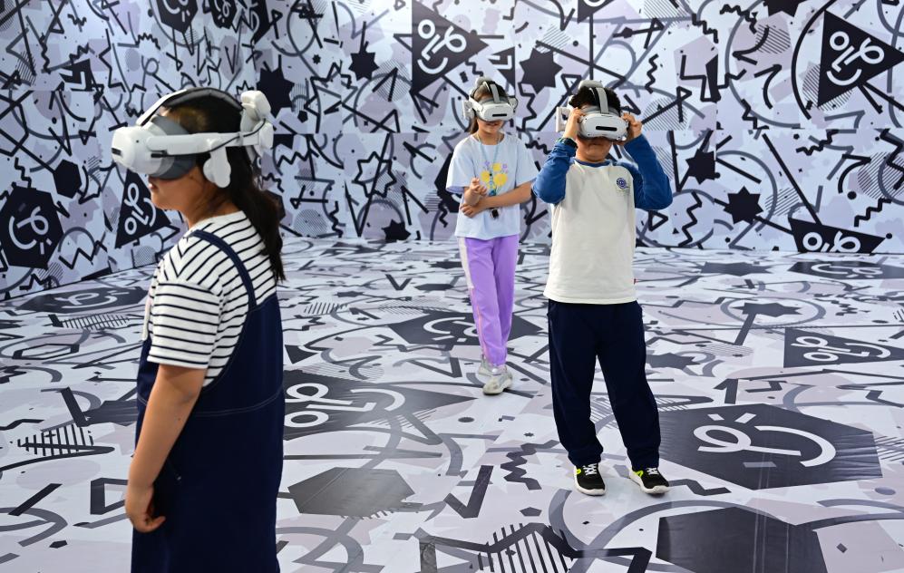 4月26日,小朋友們在第三屆中國(安徽)科技創(chuàng)新成果轉(zhuǎn)化交易會上體驗VR設(shè)備。新華社記者 周牧 攝