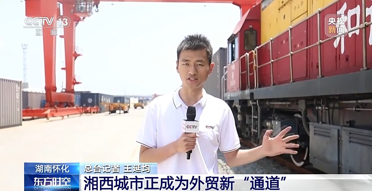 總臺記者 王延均:這是一條即將發(fā)往老撾的貨運專線,一共有70標(biāo)箱,里面滿載著湖南省內(nèi)生產(chǎn)的新能源汽車、小家電、農(nóng)機(jī)、太陽能板等貨物。預(yù)計三天左右的時間就能把這些貨物從懷化運到老撾萬象。目前,在這里,僅發(fā)往老撾萬象的貨運專列每周都會有三列。