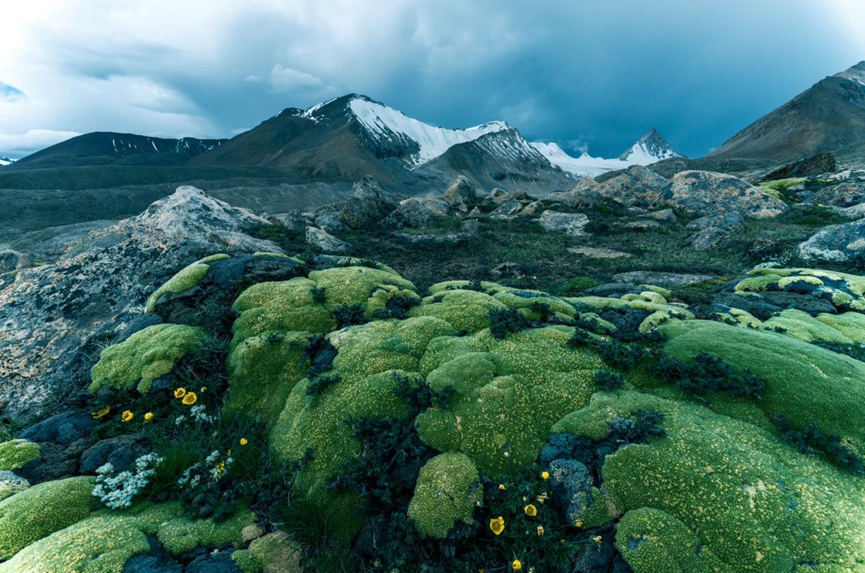 第二天一早,我們繼續(xù)向山脈的腹地去探索,前往冷布崗日腹地的道路也是無人踏足的,沒有正規(guī)車道的,所以我們同樣只能沿著牧民留下的車轍印前行。在一望無際的高原上,我們找不到路的時候就操縱無人機(jī)升空去探索路線。經(jīng)過了一整天的艱難探索,終于抵達(dá)了目的地,這個地方再往上走是完全沒有路了。在海拔約5800米左右的這個地方,不僅有巍峨壯美的雪山,還長著很多這種獨特的高山苔蘚,這種植被通常只分布在海拔4000米以上的地區(qū),極具地域特色。所以在拍攝時,我將這些高原特有的植被作為前景,既展現(xiàn)了高原生態(tài)風(fēng)貌,也作為海拔高度的天然標(biāo)識,然后遠(yuǎn)處雄偉的冷布崗日雪山則構(gòu)成了畫面的核心部分。