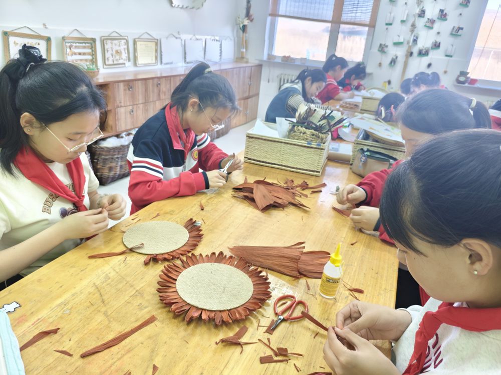 內(nèi)蒙古林西縣統(tǒng)部小學(xué)的學(xué)生正在制作玉米皮粘貼畫(huà)。(受訪者供圖)