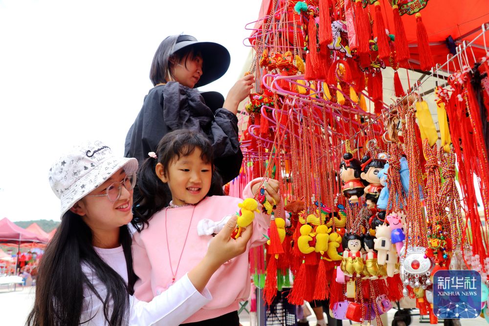 5月24日,在甘肅省平?jīng)鍪徐o寧縣成紀(jì)文化城廣場,人們在選購香荷包。新華社發(fā)(王毅攝)