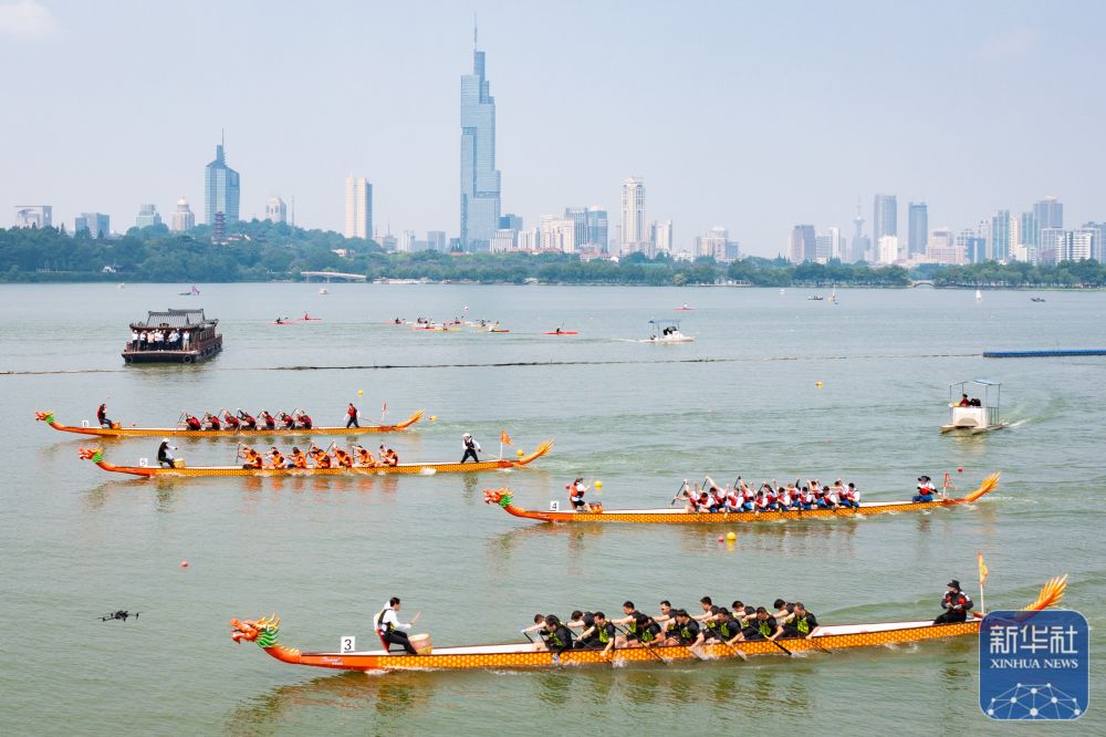 5月24日,龍舟隊(duì)伍在南京玄武湖上競逐(無人機(jī)照片)。新華社發(fā)(蘇陽攝)