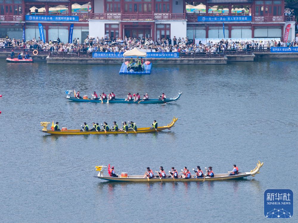 5月24日,龍舟隊(duì)在江蘇省南京市莫愁湖公園參加比賽(無人機(jī)照片)。新華社發(fā)(楊素平攝)