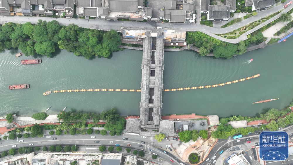 5月24日,在貴州省銅仁市碧江區(qū)錦江水域,觀光龍舟從風(fēng)雨橋下穿過(無人機(jī)照片)。新華社發(fā)(申逸愷攝)
