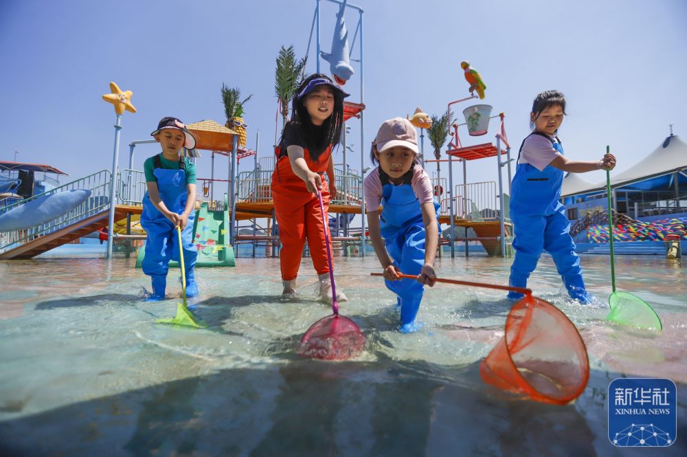 5月24日,游客在河北省遵化市南山常樂谷景區(qū)水世界參加親子撈魚活動(dòng)。新華社發(fā)(劉滿倉攝)