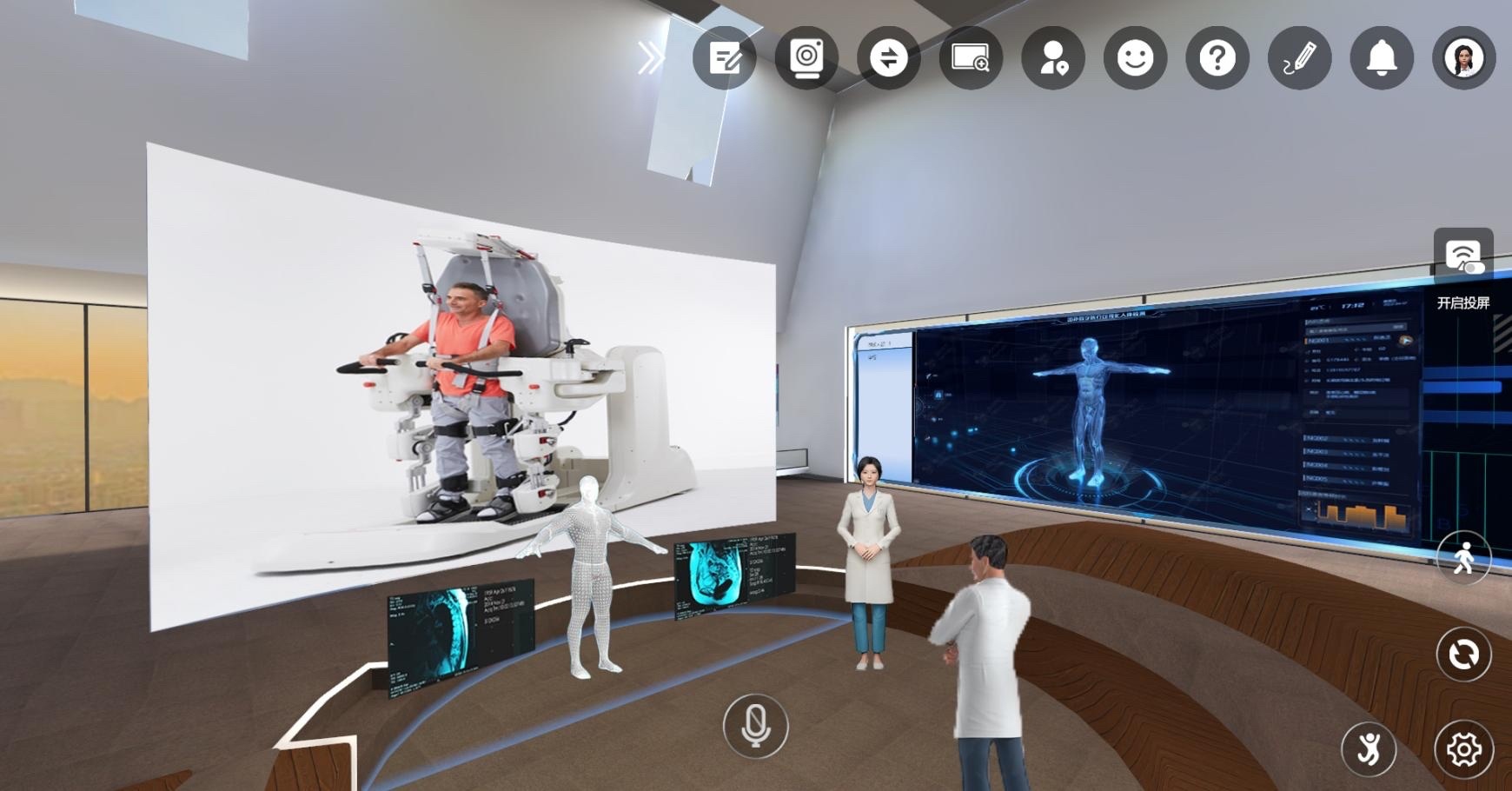 “就像推開一扇通往平行世界的門,這種‘在場感’是傳統(tǒng)遠程協(xié)作難以企及的?!本S賽客首席運營官徐晨翔邊演示邊解釋道。他調(diào)出了VS·work中的“智聯(lián)康復(fù)元診療平臺”——這是維賽客在醫(yī)療元宇宙領(lǐng)域的創(chuàng)新應(yīng)用,集成了病情診療、康復(fù)訓練、社交培訓等功能。在虛擬界面中,醫(yī)生可以通過高精度空間定位系統(tǒng)“走進”患者的虛擬診療室,患者則通過可穿戴設(shè)備完成肌力評估、平衡訓練等動作,數(shù)據(jù)實時反饋至醫(yī)生終端,為偏遠地區(qū)的患者提供了更加便捷、高效的診療服務(wù)。