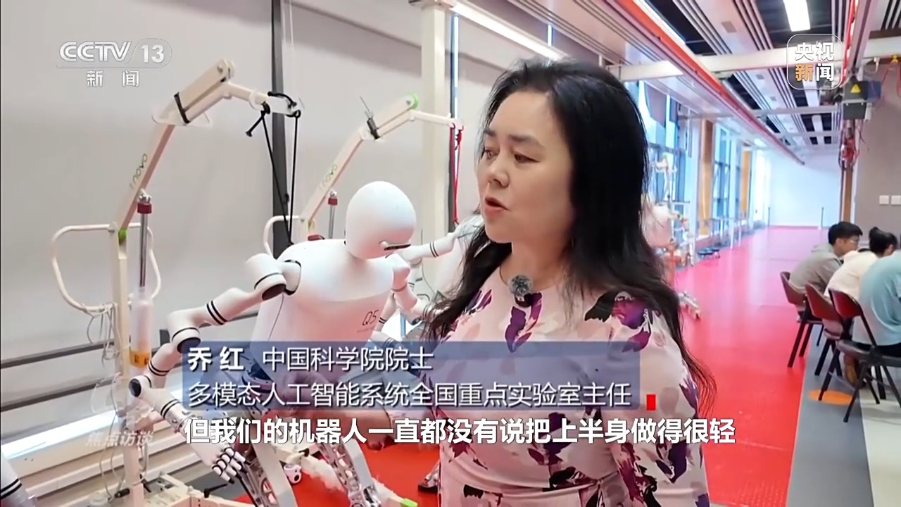 中國科學(xué)院院士、多模態(tài)人工智能系統(tǒng)全國重點(diǎn)實(shí)驗(yàn)室主任 喬紅:人形機(jī)器人都是自由度(關(guān)節(jié))比較多,但我們的機(jī)器人一直都沒有把上半身做得很輕,因?yàn)樗且鳂I(yè)的、干活的,所以沒有專門追逐要跑得快,跑得快也是我們的期望,現(xiàn)在也能跑2.2米每秒。