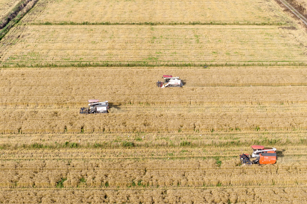浙江寧波余姚市臨山鎮(zhèn)小麥機(jī)收?qǐng)鼍?。(張輝 攝)