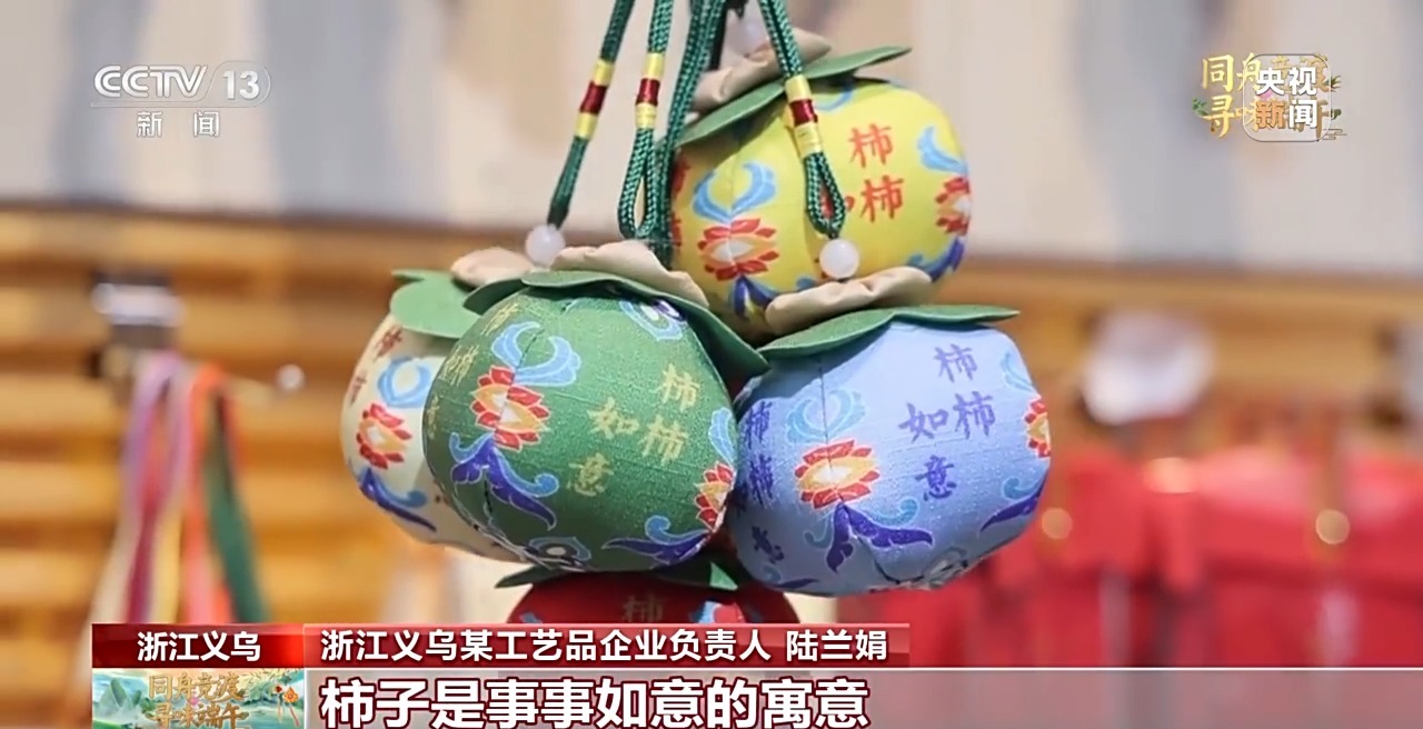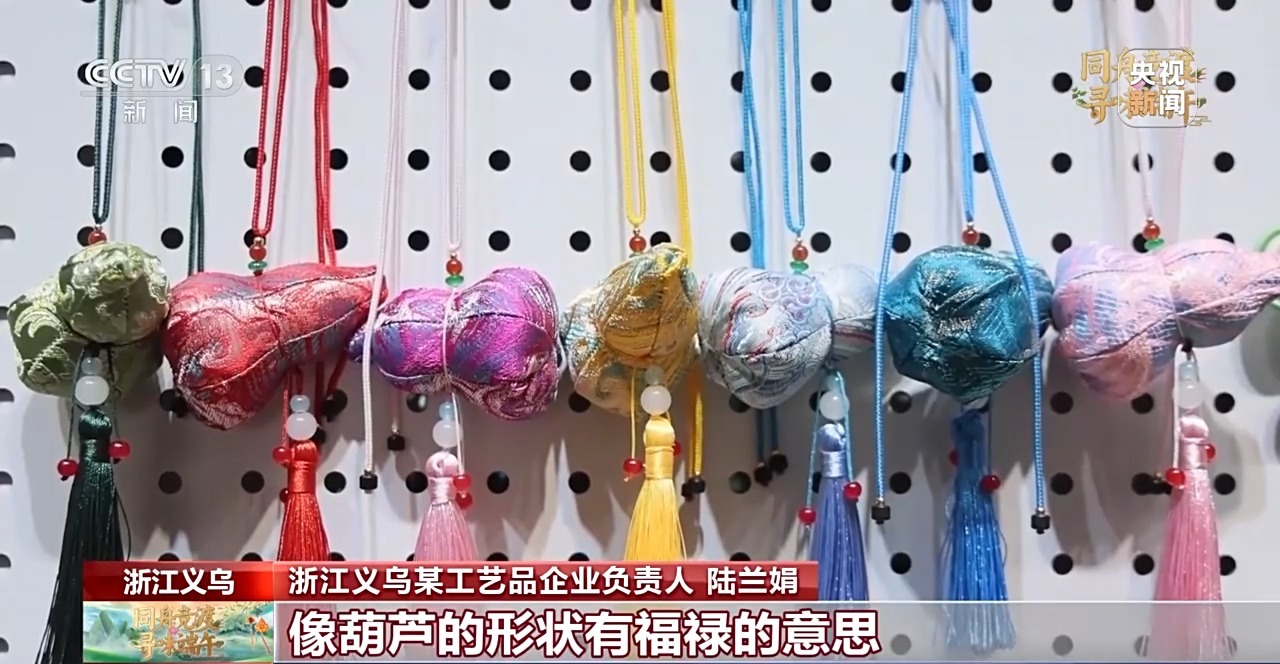 義烏某工藝品企業(yè)負(fù)責(zé)人 陸蘭娟:今年,在香囊的外觀設(shè)計(jì)上面,我們結(jié)合了中國傳統(tǒng)節(jié)日祝福的元素,設(shè)計(jì)了立體葫蘆、柿子等款式。像葫蘆的形狀有福祿的意思;柿子有事事如意的寓意,都是今年的“爆款”。
