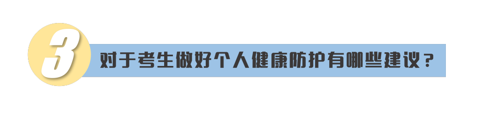考生要做好個(gè)人防護(hù),當(dāng)好自身健康第一責(zé)任人。考前盡量減少聚集和流動(dòng),不去人員密集場(chǎng)所。同時(shí),調(diào)整好心理狀態(tài),保證合理的飲食、充足的睡眠、適當(dāng)?shù)纳眢w鍛煉,如有不適,要及時(shí)就醫(yī)治療,謹(jǐn)防因身體不適而影響考試。對(duì)于發(fā)熱或者突發(fā)急病等考生,也不必?fù)?dān)心恐慌,各地考點(diǎn)都制定了相應(yīng)的預(yù)案。