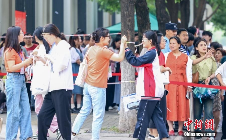 資料圖:2024年6月7日,湖北省武漢市長虹中學(xué)考點(diǎn),考生入場(chǎng)前與送考老師擊掌。張暢 攝