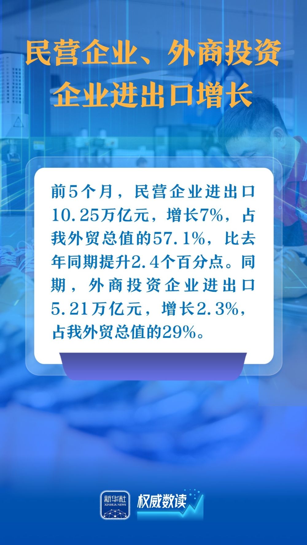 海關(guān)總署9日發(fā)布數(shù)據(jù),今年前5個月,我國貨物貿(mào)易進(jìn)出口總值17.94萬億元人民幣,同比增長2.5%。以下幾組數(shù)據(jù),展示出我國對外貿(mào)易在外部壓力下依然保持較強(qiáng)韌性。