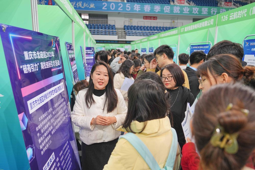 3月28日,西南大學(xué)應(yīng)屆畢業(yè)生在2025年春季促就業(yè)攻堅(jiān)行動(dòng)綜合類雙選會(huì)現(xiàn)場(chǎng)了解崗位信息。新華社發(fā)(秦廷富攝)
