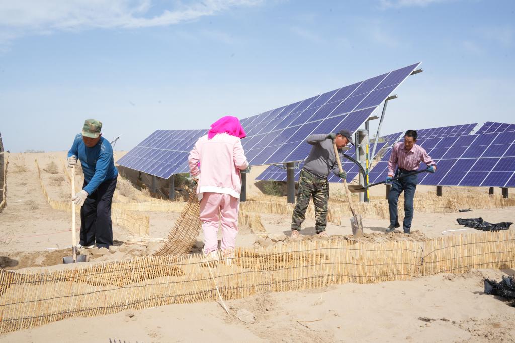 連日來,地處黃河“幾字彎”北岸的巴彥淖爾市臨河區(qū)新華林場(chǎng)光伏治沙項(xiàng)目區(qū)機(jī)器轟鳴,新華鎮(zhèn)隆光村村民吳瑞喜和其他村民利用夯土機(jī)打地基。“現(xiàn)在,我們種的小麥剛抽穗、玉米已澆水,村民們趁著農(nóng)閑到這里打工,一天能掙300元,大家參與防沙治沙的積極性都很高?!眳侨鹣舱f。