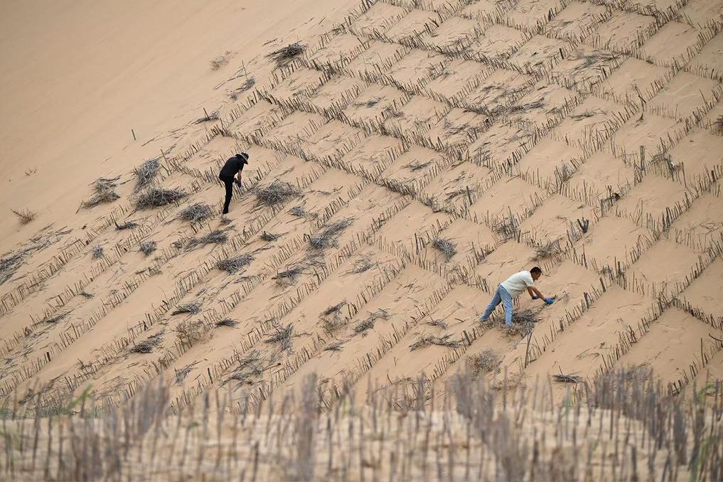 鄂爾多斯市達(dá)拉特旗農(nóng)民在防沙治沙項(xiàng)目區(qū)鋪設(shè)沙障。新華社發(fā)(楊耀中 攝)